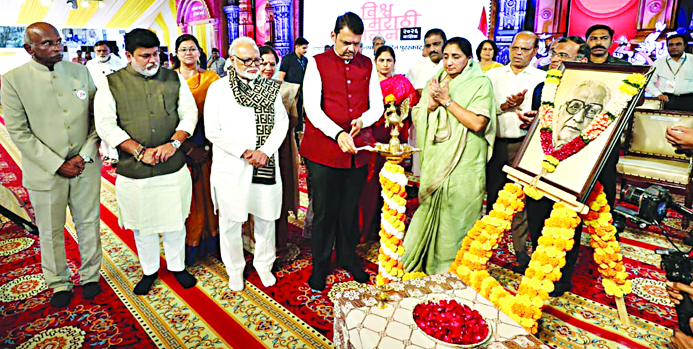 नाशिकमध्ये आयोजित चौथ्या विश्व मराठी संमेलनाचे उद्घाटन मुख्यमंत्री फडणवीस यांच्या हस्ते शुक्रवारी (दि.27) झाले. यावेळी उद्घाटनपर भाषणात ते मराठी साहित्य किती समृद्ध आहे यावर बोलत होते. व्यासपीठावर उपमुख्यमंत्री सुनेत्रा पवार, मंत्री उदय सामंत, छगन भुजबळ, गिरीश महाजन, महापौर हिमगौरी आहेर-आडके, खा. राजाभाऊ वाजे, खा. डॉ. शोभा बच्छाव, आ. राहुल ढिकले, आ. देवयानी फरांदे, आ. माणिकराव कोकाटे आदींसह उपस्थित होते.