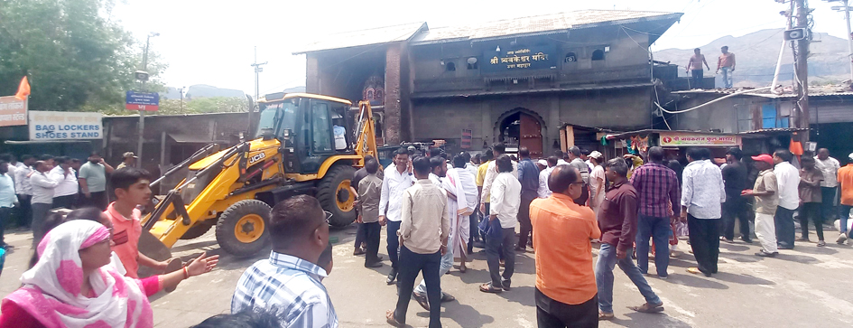 याबाबत व्यावसायिकांना 17 एप्रिल 2026 रोजी सायंकाळी मंदिर देवस्थान ट्रस्टने तीन दिवसांची नोटीस दिली होती. त्यानंतर 20 एप्रिल रोजी मंदिर ट्रस्ट कार्यालय इमारतीत व्यावसायिकांच्या समवेत सचिव तथा मुख्याधिकारी गोविंद जाधव यांच्यासमवेत बैठक घेऊन चर्चा केली. दरम्यान, सोमवारी सायंकाळनंतर बहुतांश व्यावसायिकांनी आवरासावर करत दुकानातील साहित्य हलवण्यास सुरुवात केली होती. मंगळवारी सकाळी दहाच्या सुमारास प्रांताधिकारी पवन दत्ता येथे उपस्थित झाले. त्यांच्या आदेशाने प्रत्यक्ष कारवाईला प्रारंभ करण्यात आला. दोन जेसीबीच्या सहाय्याने पाडकामाला सुरुवात झाली. तोपर्यंत काही व्यावसायिक मुंबई उच्च न्यायालयात गेले होते. त्यांनी कारवाईबाबत हरकत घेतल्याने प्रशासनावर कारवाई अर्धवट सोडून देण्याची नामुष्की ओढावली. दुकाने हटवताना व्यावसायिकांनी आक्षेप नोंदवले. त्यामध्ये काही ठळक बाबी पुढे आल्या आहेत.